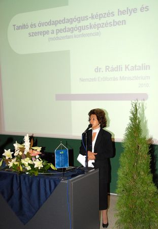 Első plenáris előadóként dr. Rádli Katalin, a Nemzeti Erőforrás Minisztérium Felsőoktatási Főosztályának főosztályvezető-helyettese A tanítóképzés helye és szerepe a pedagógusképzésben címmel a magyar és az európai oktatási rendszereket mutatta be, és körvonalazta a magyar oktatásügy előtt álló legfontosabb feladatokat. A képzési rendszer átalakításának leglényegesebb tennivalóit a közoktatásban már elvégezték; a feladat az, hogy a jövő pedagógusait is felkészítsük az oktatás szemléletének és tartalmának módosulásaira. Kiemelten fontos célnak nevezte, hogy a tanítóképzésben minőségi diplomát adjunk a jelöltek kezébe, és igyekezzünk megtartani őket a képzettségüknek megfelelő pályán. Figyelmeztetett arra, hogy ma a kutató tanítók és óvodapedagógusok számára a szakmai előrehaladás, fejlődés útja a tanárrá válással, a tanári diploma megszerzésével jár együtt. Meg kell nyitni tehát a szakmai karrier, a „tudós tanítóvá” válás lehetőségét azzal, hogy az óvodapedagógusok és a tanítók saját szakmájukban szerezhessenek tudományos fokozatot. Ezzel a pedagógusi szakma elismerné annak a gyakorlati munkának az értékét és tudományos jelentőségét, amelyet a közoktatás alsóbb szintjein, a legfiatalabb korosztályokkal dolgozó pedagógusok végeznek. További feladatok várnak tehát a felsőfokú képzés, a pedagógusképzés területén is az oktatásügyre, ezek megvalósítására kiemelten fontos időszak a 2011-es év I. féléve, amikor Magyarország adja – Belgiummal és Spanyolországgal közösen – az Európai Unió Tanácsának elnökségét.